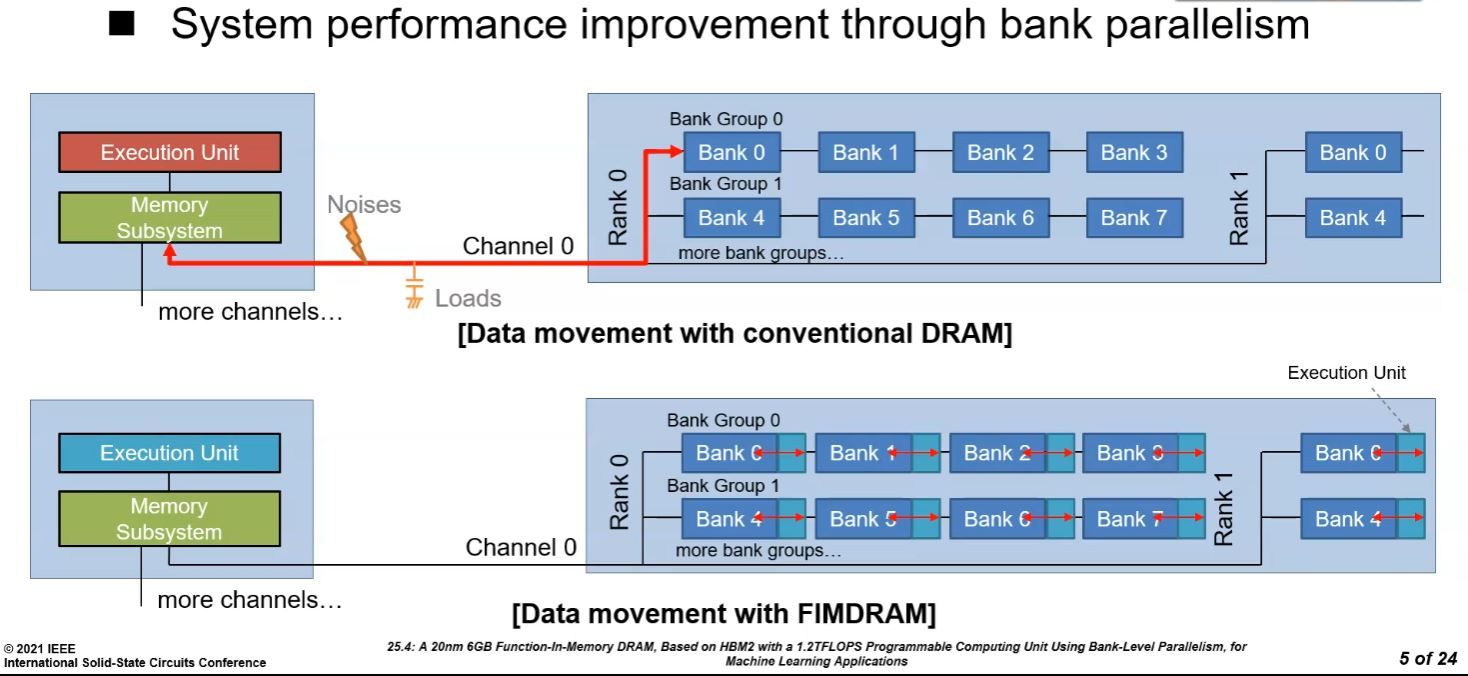 Yukarıdaki slaytlarda görebileceğiniz gibi yeni bellekte, her bellek yuvasına gömülü 300 MHz’de çalışan bir Programlanabilir Hesaplama Birimi (PCU) bulunuyor. Bu birim, DRAM içi hesaplamaları etkinleştirmek için ana bilgisayardan gelen geleneksel bellek komutlarıyla kontrol edilip standart veya FIM (hesaplama) modunda çalışabiliyor.