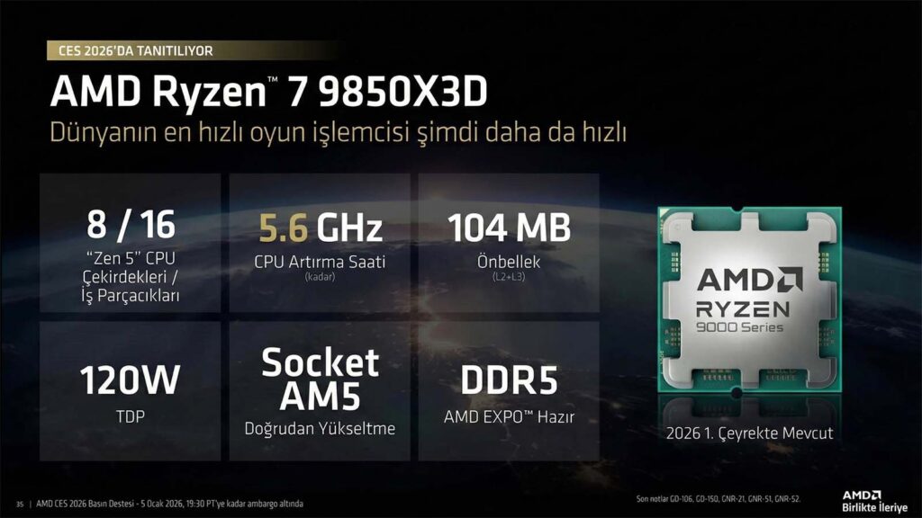 AMD, CES 2026 kapsamında düzenlediği etkinlikte, oyuncuların merakla beklediği yeni işlemcisi Ryzen 7 9850X3D’yi resmen tanıttı. Dell sızıntıları ve AMD’nin kendi raporlarında sıkça yer alan bu model, şirketin popüler 9800X3D işlemcisinin “daha yüksek kaliteli silikonlarla” (binned) üretilmiş ve hız aşırtılmış özel bir versiyonu olarak karşımıza çıkıyor.