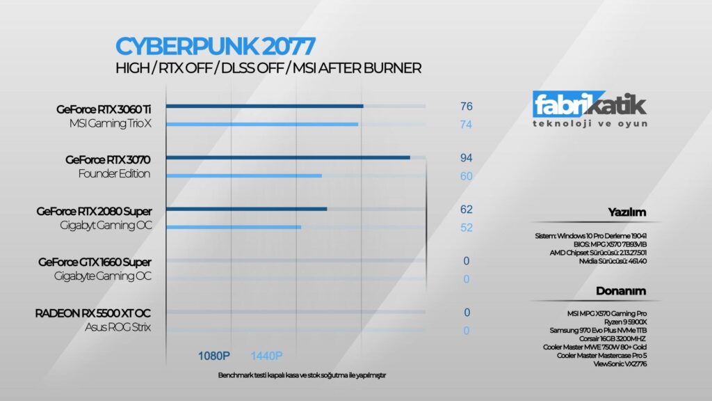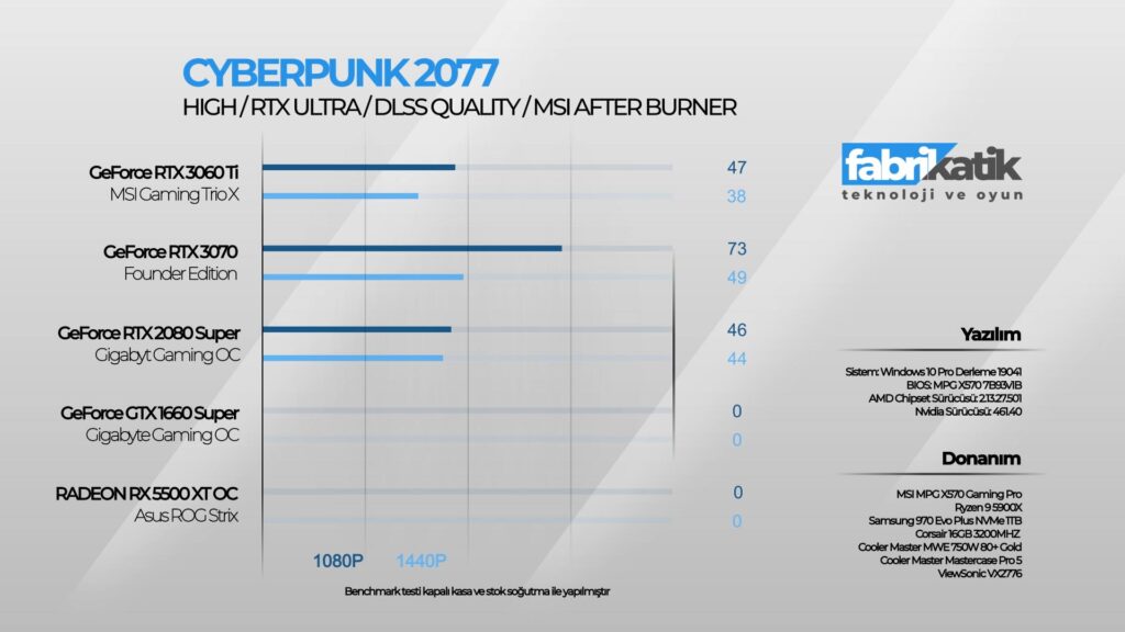 Devamında optimizasyon sorunları konusunda gündem olan oyun Cyberpunk 2077’yi hem RTX açık hem de RTX kapalı şekilde test ettim(bütün ayalar high). RTX açık şekilde 1080p’de 47 FPS, 1440p’de 38 FPS sonuç aldım. Bu sonuç düşük gibi dursa da sistem katili Cyberpunk 2077 için başarılı bir sonuç. Ayrıca Cyberpunk 2077’yi RTX ve DLSS kapalı şekilde de test ettim. Bu şekilde de 1080p’de 76 FPS, 1440p’de 74 FPS sonuç aldım. Dikkat ettiyseniz RTX ve DLSS kapalı en yüksek ayarlarda 1080p ve 1440p çözünürlükte FPS konusunda çok bir kazanç sağlayamadım. Çünkü Cyberpunk 2077, optimizasyon konusunda hala düzeltilmesi gereken bir oyun. Tabi ki Cyberpunk 2077 içerisinde birçok görüntü ayarı mevcut. Hem RTX hem de DLSS ayarlarıyla oynayarak ideal sistem ayarınızı bulup oyunu RTX açık 60 FPS’de stabil şekilde oynayabilirsiniz. Bu sonuçlar şimdilik böyle(1.12 yamasıyla) çünkü zamanla Cyberpunk 2077’ye gelecek yamalarla performans sorunları düzeltildiğinde FPS oranı daha da artacaktır diye düşünüyorum.