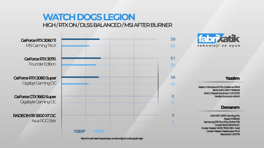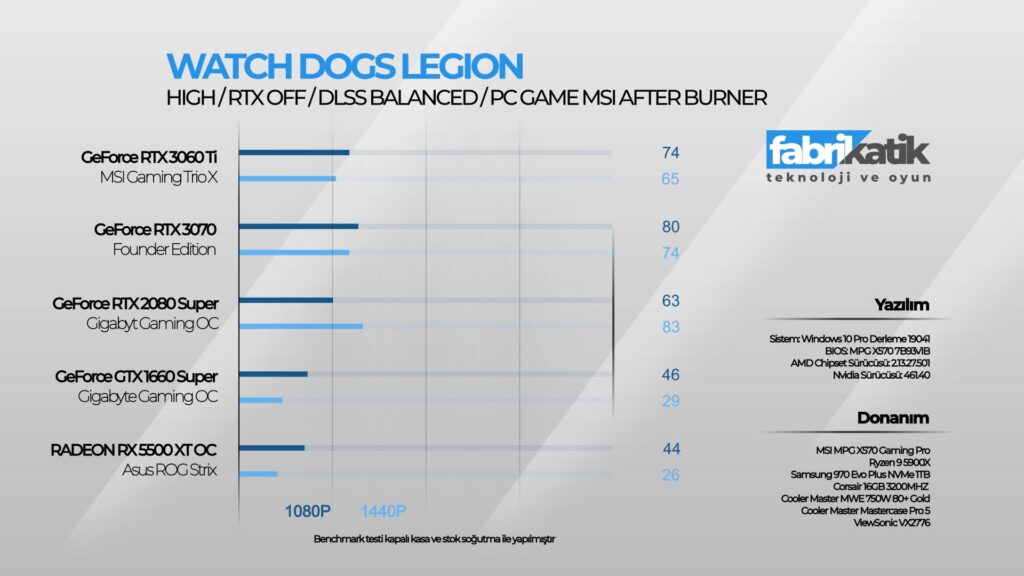 Başka bir RTX canavarı Watch Dogs: Legion ile teste devam ettim. Watch Dogs: Legion hem RTX açık hem de RTX kapalı her durumda sistemi bir hayli yoran bir oyun. WD: Legion her ne kadar oyuncular tarafından eleştirilmiş olsa da detaylı bir Londra tasarımına sahip. Bu yüzden bilgisayarlar bu detayları renderlarken performans düşüklüğü yaşatabiliyor. Watch Dogs: Legion RTX açık ve DLSS Balanced ayarda 1080p 59 FPS, 1440p 43 FPS; RTX kapalı ve DLSS Balanced ayarda 1080p 74 FPS,1440p 65 FPS sonuç verdi. MSI RTX 3060 Ti Gaming X Trio ile oyunlar 1440p’de çok rahat 60 FPS’de oynanabiliyor. Yazının başında da belirttiğim gibi RTX 3060 Ti Gaming X Trio, oyunları 1440p çözünürlükte oynanabilmesi için tasarlanmış bir ekran kartı.