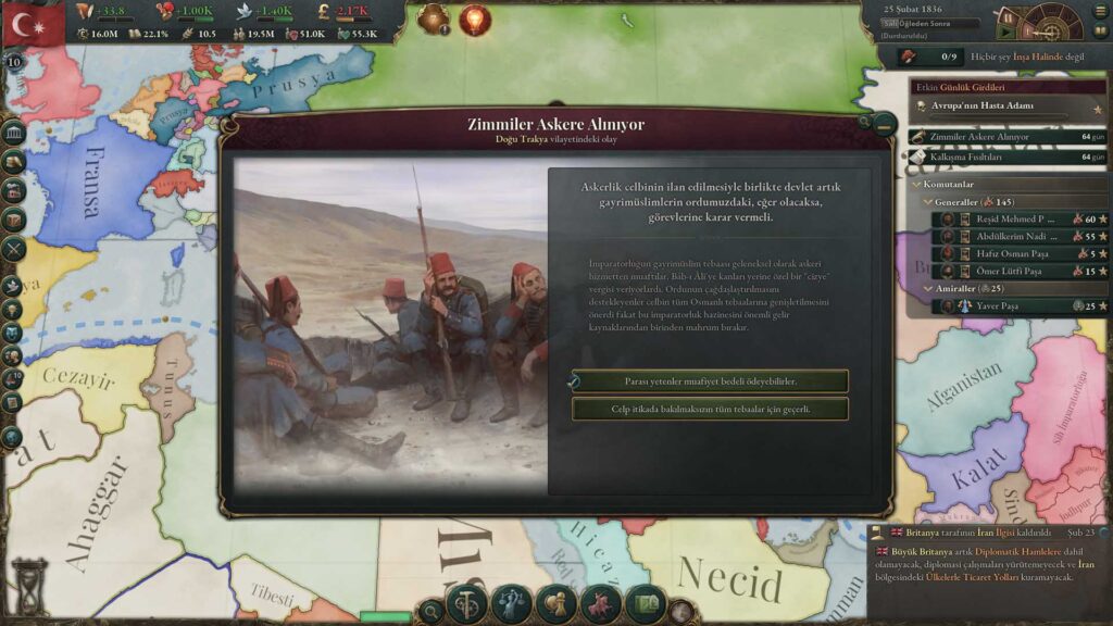 Victoria 3’de ülkeler arası diplomasi ana mekaniklerden biri diyebilirim. Oyunda yapacağınız diplomatik hamleler yönettiğiniz ülkenin kaderini olumlu ya da olumsuz şekilde etkileyecektir. Ben Osmanlı İmparatorluğu ile oynarken başta Rusya ve İngiltere’ye yanaşıp ilişkilerimi iyi hale getirmem, Mısır’ın bana karşı isyanında ciddi bir avantaj sağlayarak Mısır’la aramdaki savaşın kısa sürmesinde etkili oldu. Aksi halde yenilmesem bile savaş gereksiz uzayabilir ve ekonomimi çok daha kötü durumlara sokabilirdi. Tabi yıllar geçtikçe ve Osmanlı olarak ben güçlendikçe İngiltere için rakip görüldüm. Aram tekrar açıldı 🙂 Yani kısacası oyunda diplomasi, ekonomi ve toplum yönetme mekaniği kadar önemli.
