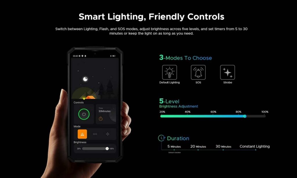 Doogee Fire 7 Pro, özellikle kampçılar ve doğa sporlarıyla ilgilenenler için tasarlanmış gibi görünüyor. Tıpkı Fire 5 Ultra’da olduğu gibi, bu modelin arkasında da 1.200 lümen parlaklığa sahip çift kamp ışığı bulunuyor. Bu ışıklar sadece aydınlatma için değil, aynı zamanda flaş ve üç farklı SOS moduyla acil durum sinyali olarak da kullanılabiliyor.