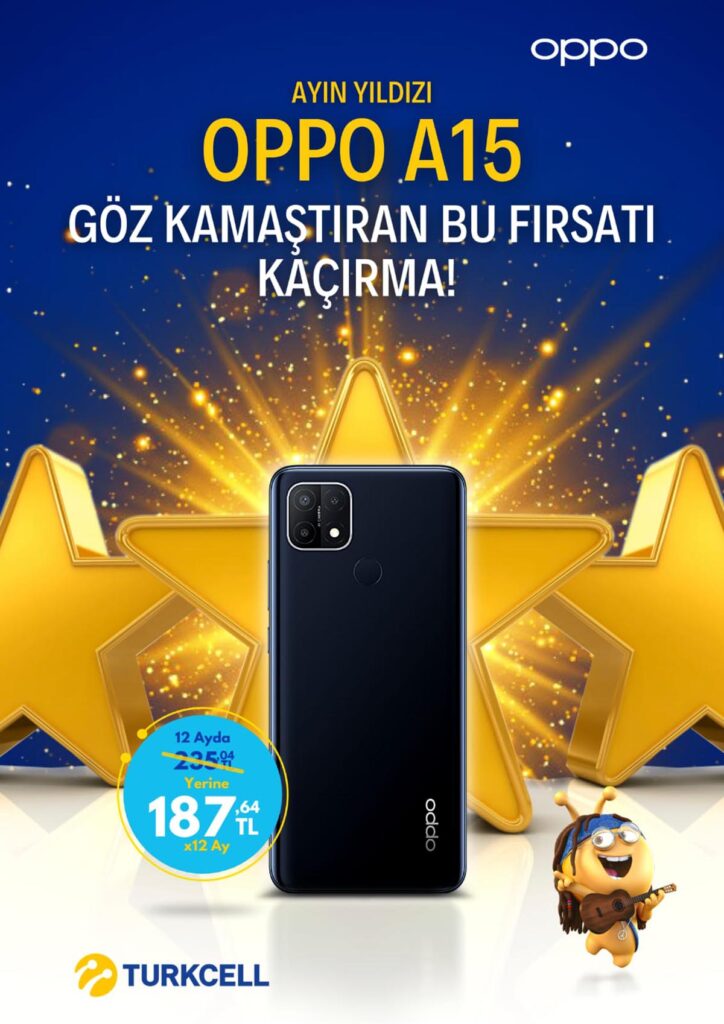 Dünyanın önde gelen lider akıllı ürün markası OPPO’nun A15 modeli Turkcell mağazalarında Ayın Yıldız Ürünü olarak indirimli fiyatlar üzerinden tüketiciyle buluşuyor. 26 Temmuz’a kadar devam edecek kampanya kapsamında tüketiciler hem peşin alımlarında hem de taksitli ödemeyi seçtiklerinde A15 modeline indirimli fiyat üzerinden sahip olabilecekler. OPPO A15 modeli kampanya bitimine kadar peşin ödemede 2.199 TL yerine 1.899 TL fiyat üzerinden tüketicilere sunulacak. 12 aylık taksitli ödeme planında ise aylık taksit tutarı 237 TL yerine 188 TL olacak.
