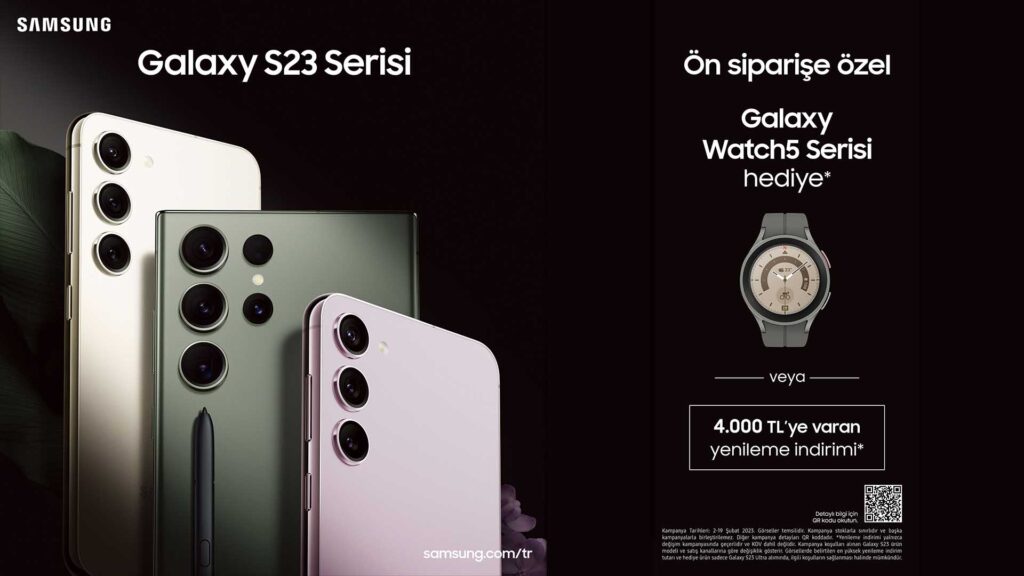 Galaxy S23 Serisi’nin ön satış dönemine özel kampanya kapsamında, Galaxy S23 veya Galaxy S23+ alacaklara Samsung Galaxy Watch5 akıllı saat, Galaxy S23 Ultra alacaklara ise Galaxy Watch5 Pro akıllı saat hediyesi sunuluyor. Samsung, bu kampanyaya alternatif olarak ayrıca değişim kampanyası kapsamında avantajlı teklifler sunuyor. Değişim kampanyası kapsamında Samsung cep telefonunu getiren kullanıcılara, Galaxy S23 için 3.000 TL, Galaxy S23+ için 3.500 TL, Galaxy S23 Ultra içinse 4.000 TL yenileme indirimi sunuluyor.