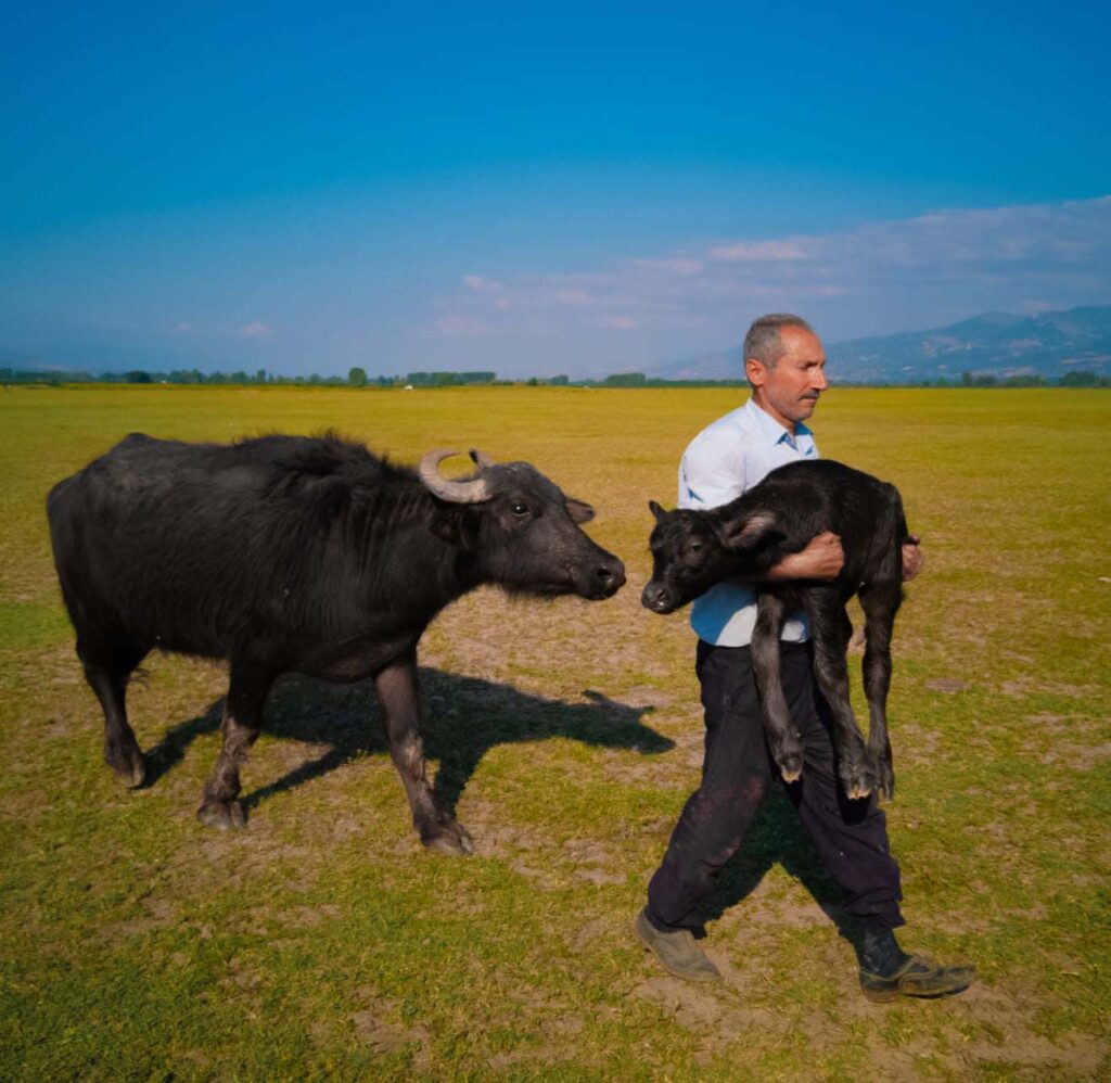 Yeni doğmuş bir manda buzağısını soğuktan korumak için kucaklayıp barınağa taşıyan bir çiftçi ve onları bir an olsun gözünü yavrusundan ayırmadan takip eden anne manda.