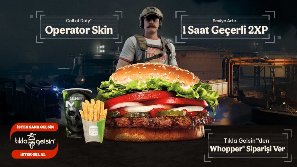 Oyun tutkunları 26 Ekim 2022 tarihinde başlayan kampanyayla Tıkla Gelsin üzerinden verdikleri her Whopper Menü siparişi ile Limited Edition Operator Skin ve 1 saat süresince Modern Warfare II’de oynayabilecekleri 2XP Kodu kazanabilecek. Kodlar, sipariş teslimi sonrası SMS ile sahiplerine ulaşacak.