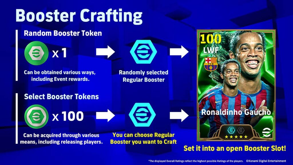 Yeni “Takviye Yuvası” (“Booster slot”), futbolcu özelliklerini kişiselleştirmede ve onlara ekstra istatistikler sağlamada yardımcı bir özellik. Kullanıcılar, “Rastgele” veya “Seçmeli” Booster Jetonları kazanıp kullanarak, 17 farklı Güçlendirici türü aracılığıyla futbolcularına ince ayar çekebilirler. Ronaldinho Gaúcho, Ludovic Giuly ve Deco gibi futbol efsaneleri yeni güncellemede bu “Booster Slot”larla Epic kartlar olarak karşımıza çıkacak.
