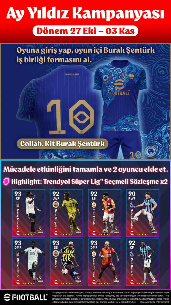 KONAMI, popüler futbol oyunu eFootball için Türkiye’deki oyuncuları heyecanlandıracak yeni bir kampanya duyurdu. “Ay Yıldız Kampanyası” kapsamında, oyuncuları sanatçı Burak Şentürk imzalı özel bir formanın yanı sıra Trendyol Süper Lig temalı birçok özel içerik ve ödül bekliyor.