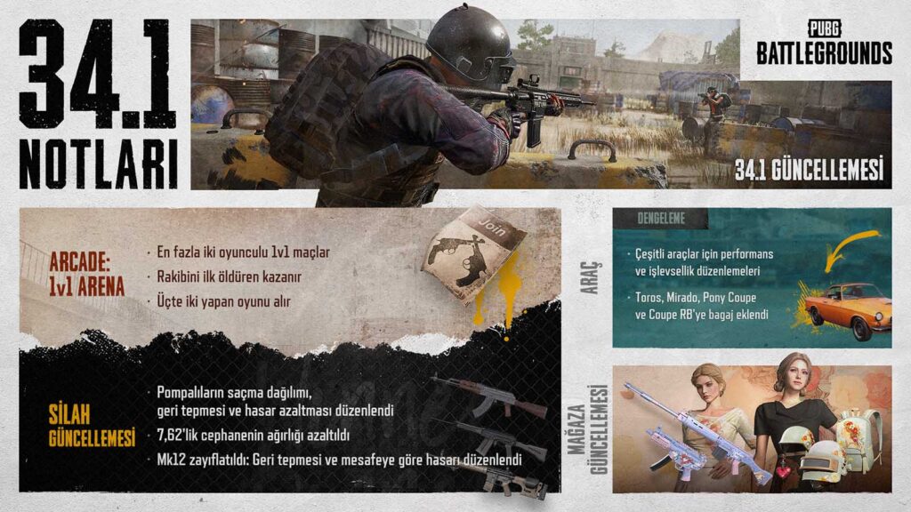 PUBG: BATTLEGROUNDS’un yeni 34.1 güncellemesi PC için yayında! Konsol oyuncuları ise 20 Şubat’ta güncellemeye kavuşacak. Bu güncelleme ile birlikte 1v1 Arena daha erişilebilir hale gelirken, silah dengeleri yeniden düzenleniyor ve araçlara önemli iyileştirmeler ekleniyor.