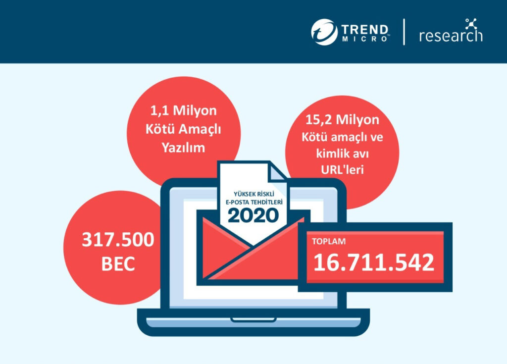 Kötü amaçlı yazılım eklenmiş e-postalar: Trend Micro, engellenmeselerdi kullanıcıların gelen kutularında görünecek kötü amaçlı yazılım içeren 1,1 milyon e-posta tespit etti. Bu, 2019 yılına göre %16 artış anlamına geliyor. Bu saldırılar genellikle hedefli fidye yazılımı habercisi olan birçok “Emotet” ve “Trickpbot” saldırısını içeriyordu.
