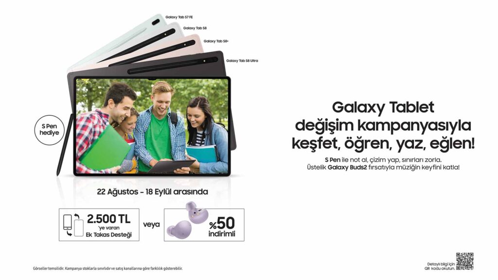Okulların açılmasına kısa bir süre kaldığı şu günlerde Samsung, Galaxy Tab S8 Ultra, Tab S8+, Tab S8 veya Tab S7 FE tabletlerden birini satın alacaklar için kaçırılmayacak bir kampanyayı duyurdu. 18 Eylül (23:59) tarihine kadar geçerli kampanya kapsamında; markası fark etmeksizin eski tablet, telefon, eski cihazını getirenlere Galaxy Tab S8 Ultra için 2500 TL, Tab S8+ için 2000 TL, Tab S8 için 1500 TL, Tab S7 FE tablet içinse 1000 TL takas desteği avantajı sunuluyor. Bu kampanyadan yararlanmak istemeyen kullanıcılar ise Galaxy Tab S8 Ultra, Tab S8+, Tab S8 veya Tab S7 FE tabletlerden birini satın aldıklarında Galaxy Buds2 kulaklıklara %50 indirim avantajıyla sahip oluyor.