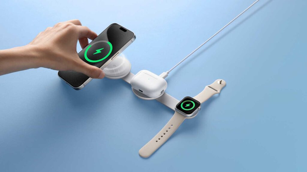 Anker UFO MagGo, aynı anda üç farklı cihazı şarj etme yeteneğiyle kablosuz şarj deneyimini bambaşka bir seviyeye taşıyor. MagSafe uyumlu iPhone’lar, AirPods ve Apple Watch için eşzamanlı kablosuz şarj desteği sunan bu cihaz, kullanıcıların şarj ihtiyaçlarını tek noktadan karşılamasını sağlıyor. 15W hızlı şarj kapasitesi, iPhone 16 ve 15 Pro’yu sadece 15 dakikada %20’ye, Apple Watch Series 9’u ise 22 dakikada %30’a kadar hızla şarj edebiliyor.