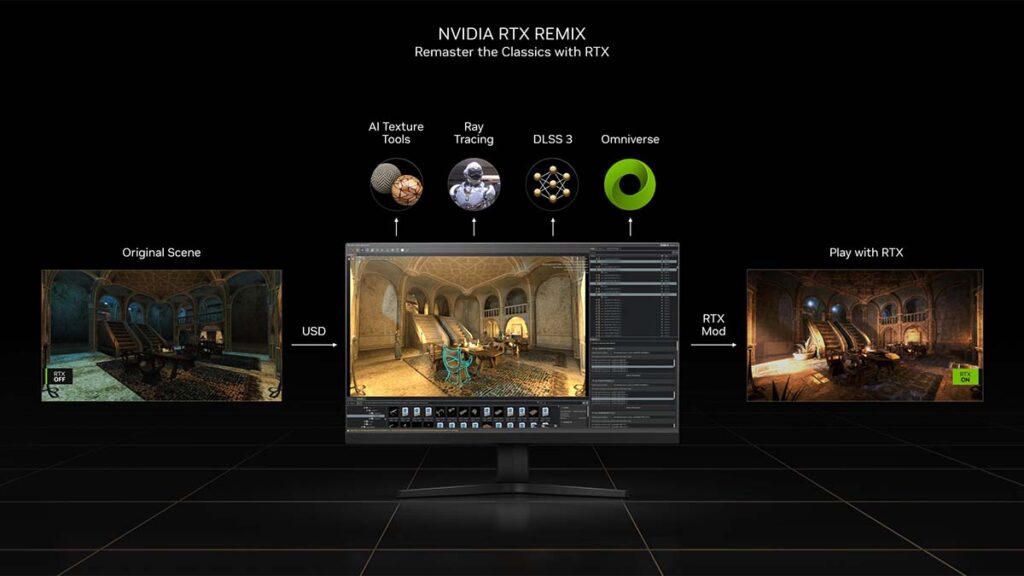 RTX Remix runtime, bir mod geliştiricisinin oyun sahnesini yakalamasına ve ardından gerçek zamanlı olarak objeleri değiştirmesine; path tracing, DLSS 3, Nvidia Reflex ve AI ile geliştirilmiş dokular gibi “RTX teknolojisi” eklemesine olanak tanıyor. Yeniden düzenlenmiş objeler daha sonra Unreal Engine, Blender ve Nvidia’nın Omniverse uygulamaları gibi çeşitli geliştirici uygulamalarına da aktarılabiliyor.